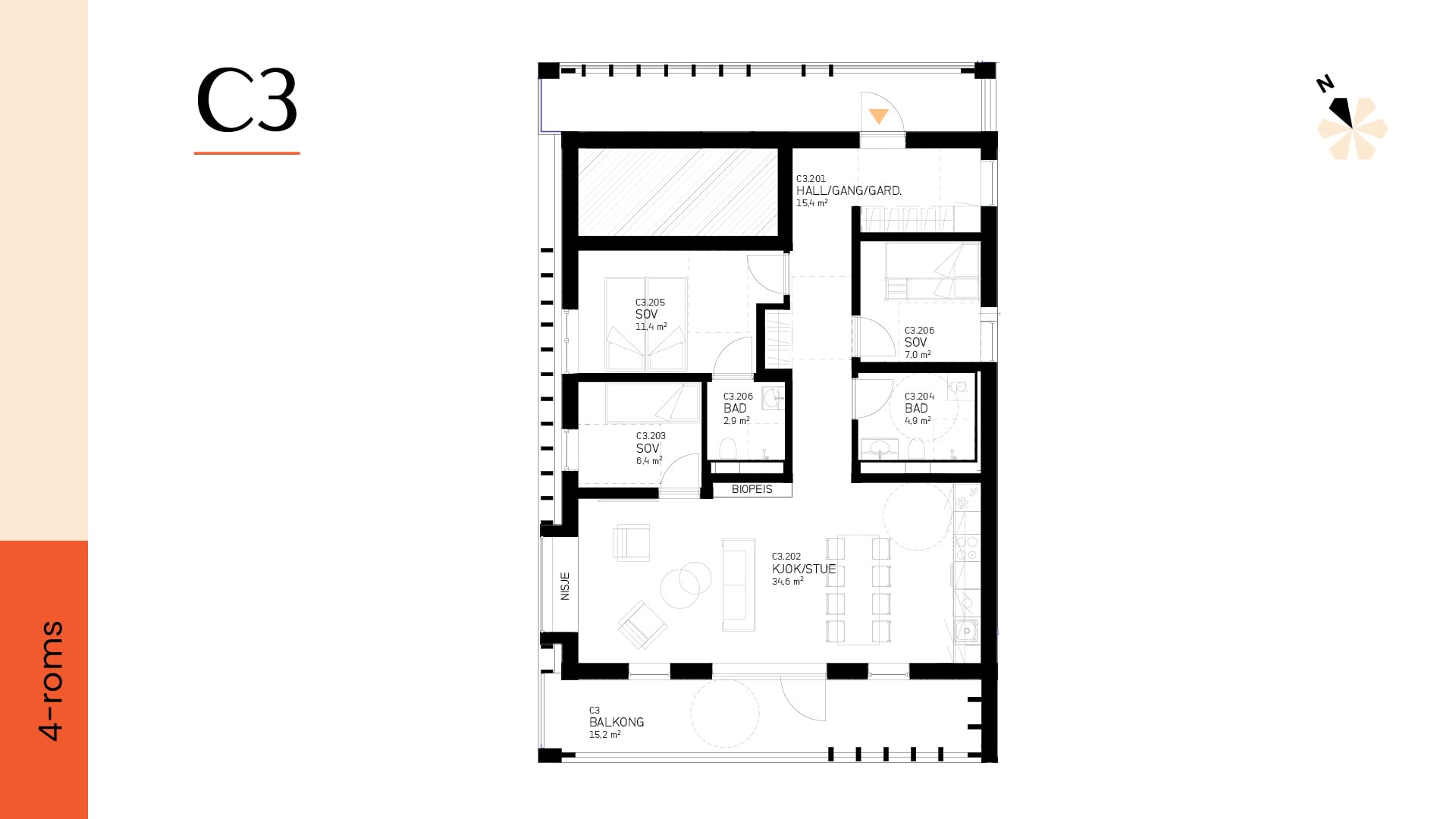 Romslig 4-roms med stor sørvendt balkong. 2 baderom, og kjøkken-/stueløsning med nisje og store vindusflater mot sør og vest.