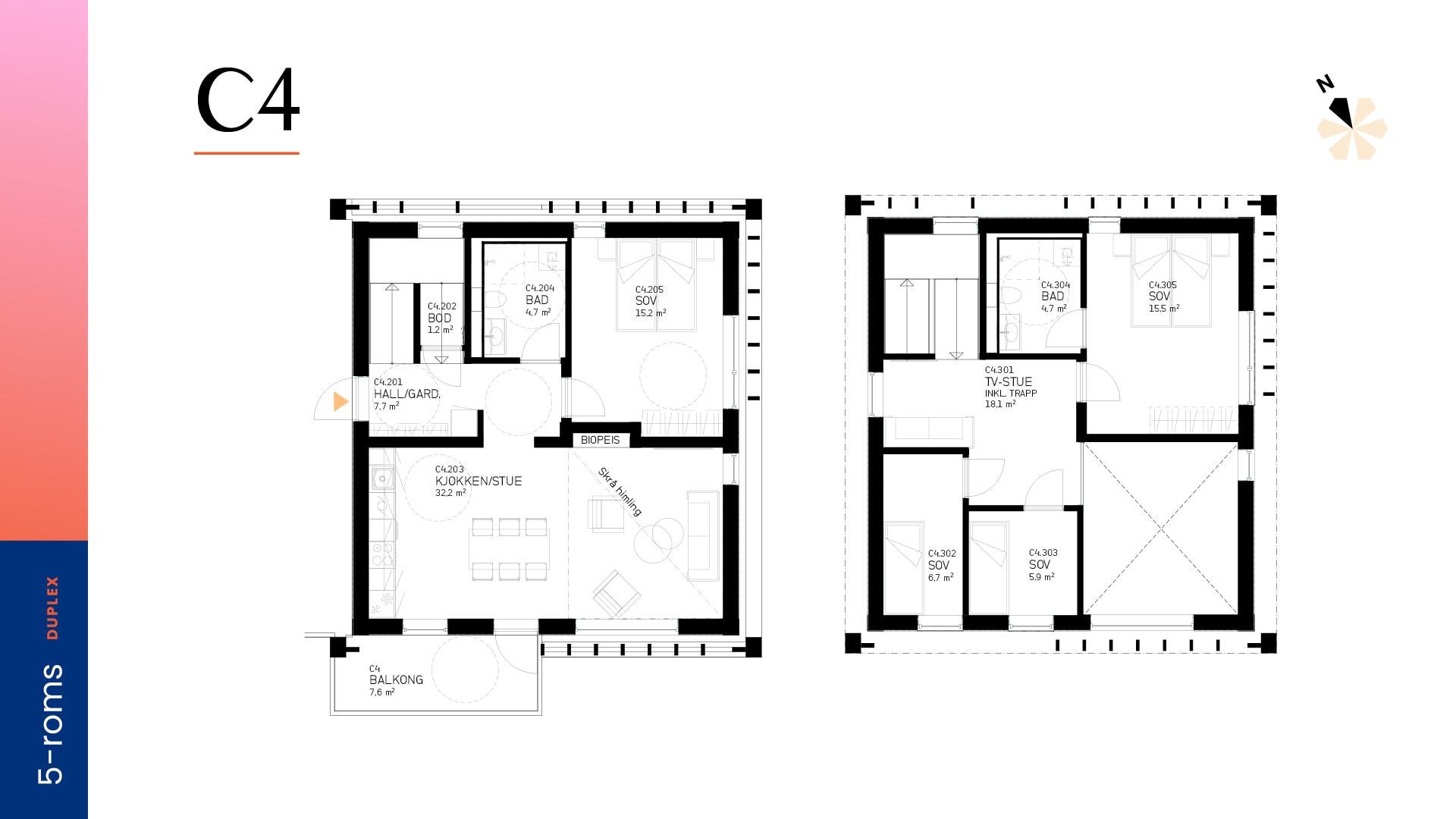 Innholdsrik 5-roms toppleilighet over to plan, med ekstra god takhøyde og sørvendt balkong. Hovedsoverom med eget bad, og ekstra TV-stue i annenetasje. Kjøkken-/stueløsning med store vindusflater mot sør.