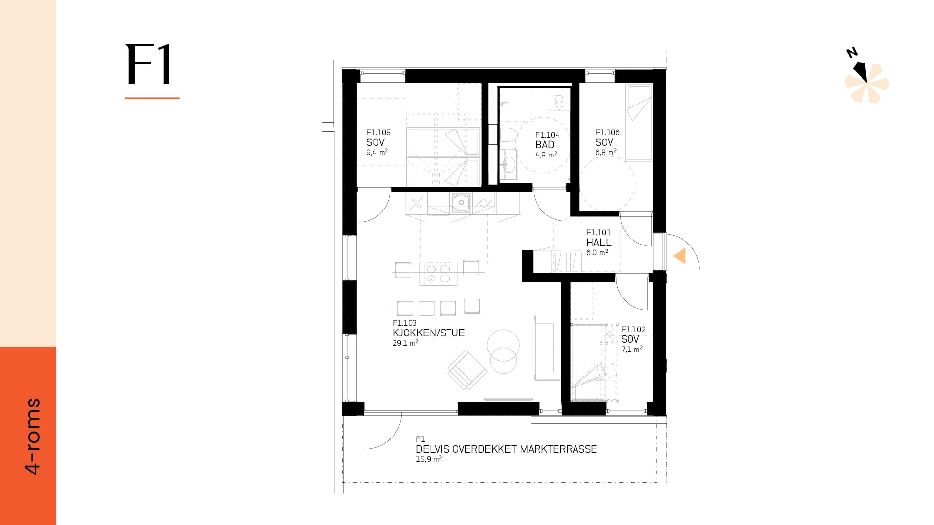 Arealeffektiv 4-roms med sørvendt terrasse, delvis under tak. Kjøkken-/stueløsning med kjøkkenøy og store vindusflater mot sør og vest.